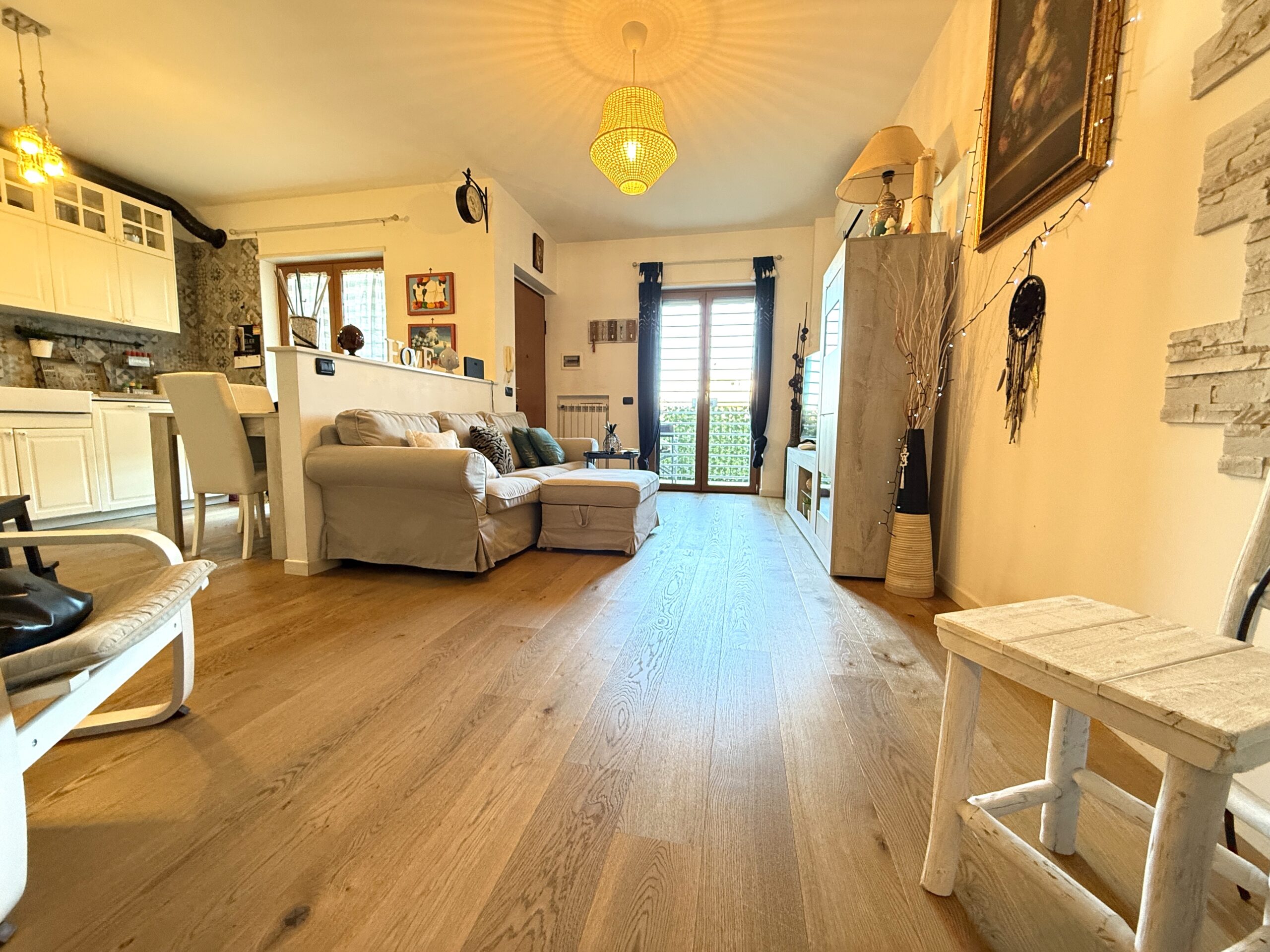 ingresso in soggiorno–pranzo open space con angolo cottura a vista,