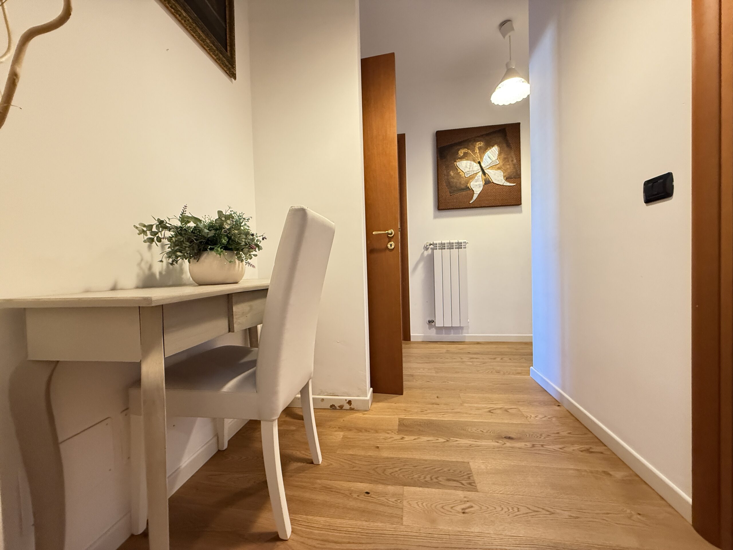 Finiture di pregio con parquet in tutta la casa, infissi legno parte interna e alluminio parte esterna con doppi vetri, inferriate su tutti gli infissi, doppia esposizione e contesto condominiale tranquillo e ben abitato.